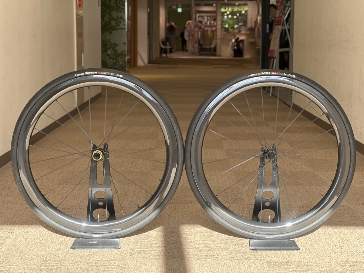 2セット目は1セット目と同じくCORSA N.EXTのクリンチャー(チューブド)仕様のタイヤを装着したANTARESカーボンホイール。チューブレスで使う予定が暫くない方や、今お使いのホイールをクリンチャー仕様で乗っていてホイールの違いをしっかり比較したい方にオススメです。おなチューブは流行りのTPU(PURPLE LITE)です!