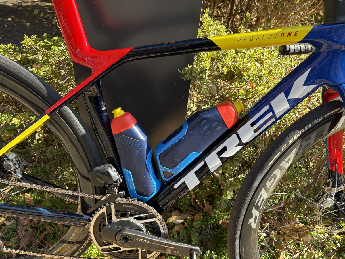 空気抵抗を低減するRSL Aeroボトルは、ダウンチューブ形状にピッタリ沿う専用デザイン。装着した状態で初めて”完成形”になるように設計されており、ボトル単体でなく、フレーム+ボトルで1つの空力パーツとして機能する。