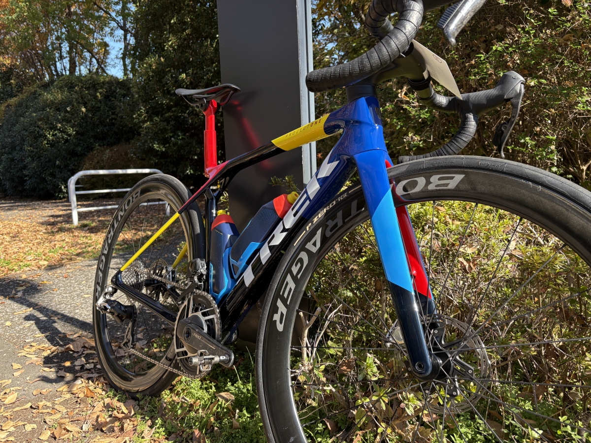 以前から「一度は乗ってみたい」と思っていた、TREKのフラッグシップモデルMadone SLR。とても存在感がありProject Oneらしい大胆なカラーリングが、フレームの造形美と完璧にマッチしていて、止まっていても速さを感じます。エアロ形状のフレームにBontrager Aeolus RSL 51ホイールの組み合わせは、見た目だけでなく実走性能も相当高そう。