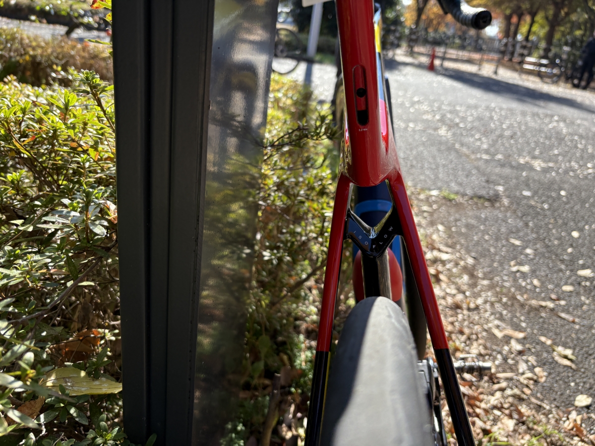 見た目のインパクトがとても強いIsoFlow(アイソフロー)最大の特徴は、空気の流れを後方へスムーズに抜く構造。シートチューブ周りに溜まりがちな乱流を減らし、エアロロードとしての巡行性能をさらに高められている。そして、穴の部分によってシートチューブがしなる余地が生まれ、路面からの細かな振動をうまくいなしてくれます。ガチガチに硬いだけのエアロロードとは違い、長時間乗っても疲れにくい乗り味に貢献している。