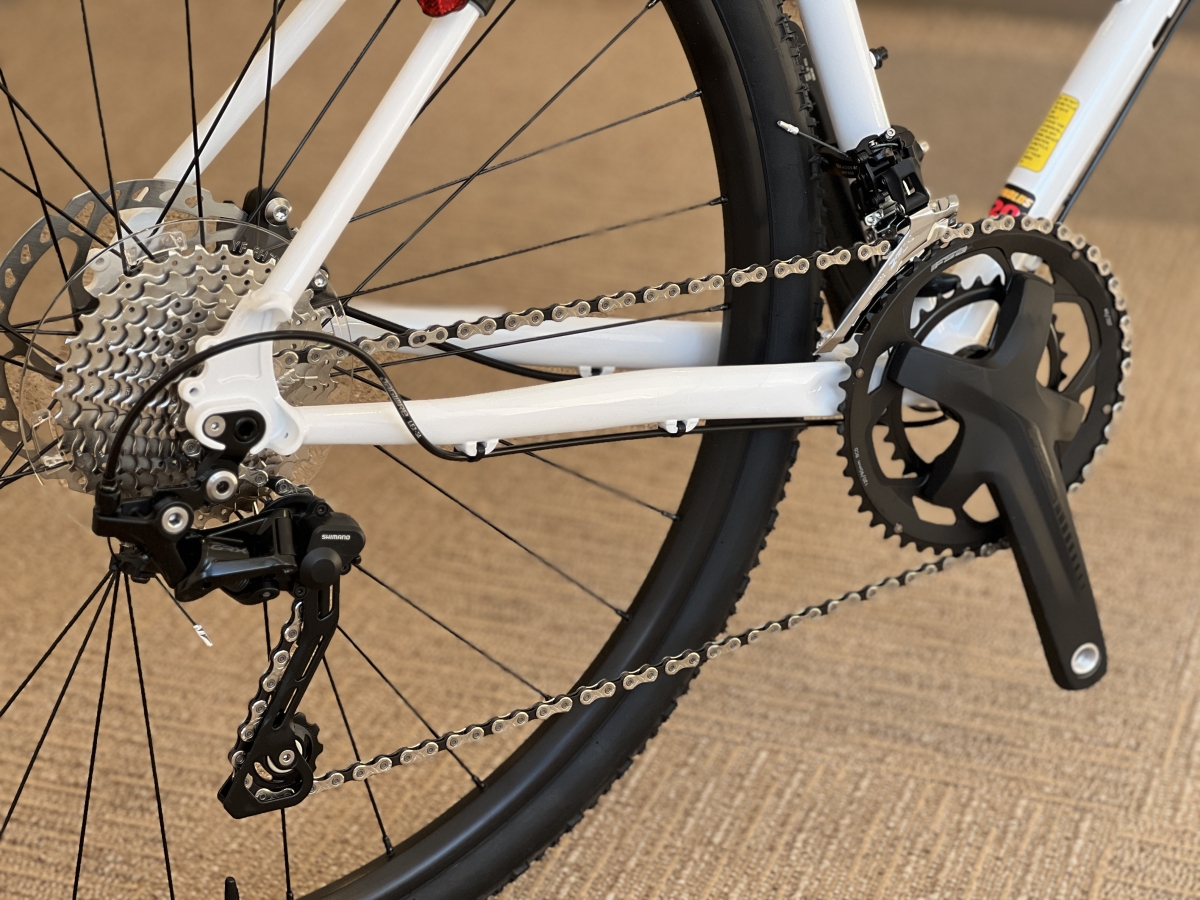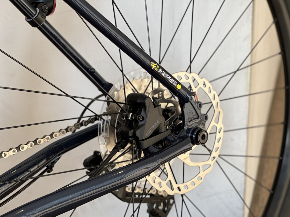 レバーや変速機はSHIMANO GRX RX400シリーズ。フロント2速、リア10速仕様です。もちろん油圧のディスクブレーキですので悪天候でも制動力が落ちづらく弱いちからでもしっかり効きます。