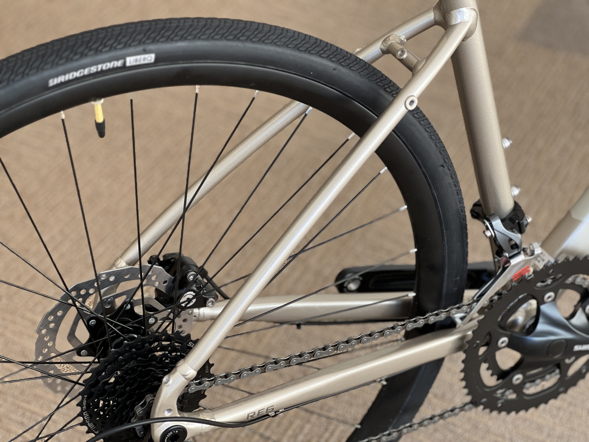 上位モデルである同社RE8と同様のエアロ形状を採用することで空力性能を確保しつつタイヤクリアランスは40c相当まで拡大。完成車に装着しているタイヤは32cなので快適性やグラベル走行を求めるなら更に太いタイヤも履けちゃいます。