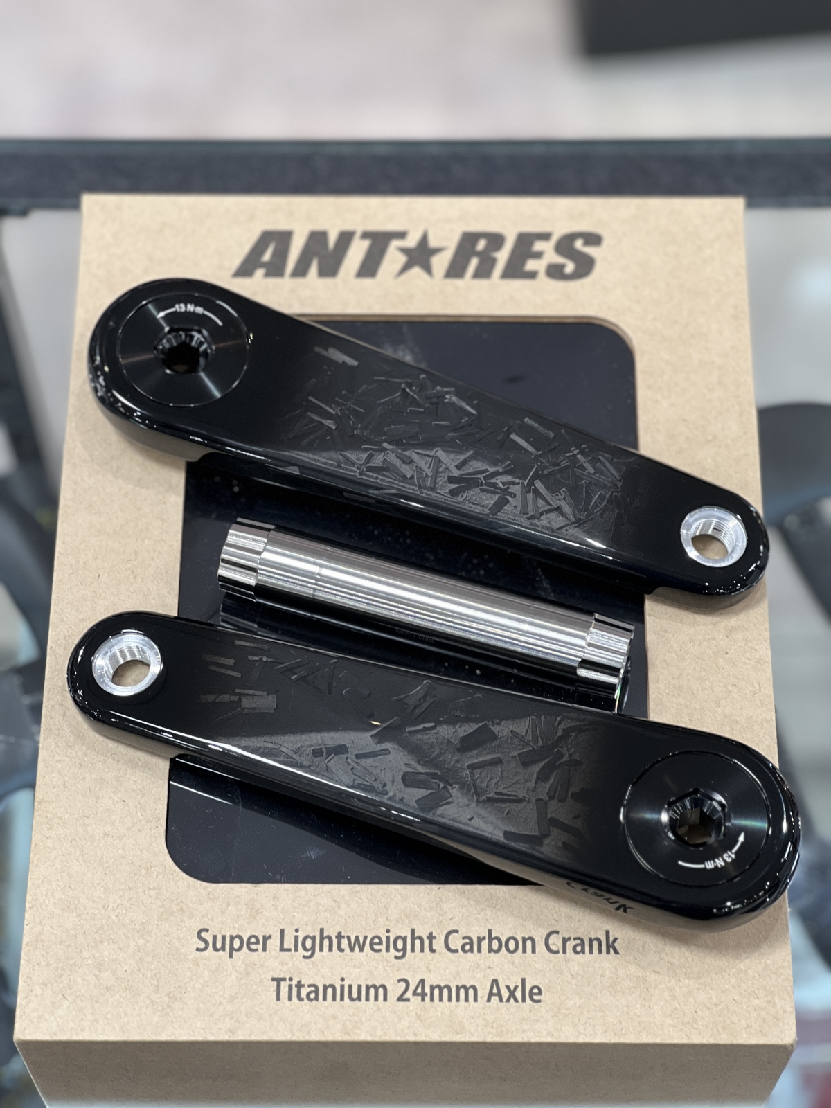 【ANTARES】当社プライベートブランドから「カーボンクランク」が登場!アクスルシャフトはチタン製で330gと軽量高剛性です。