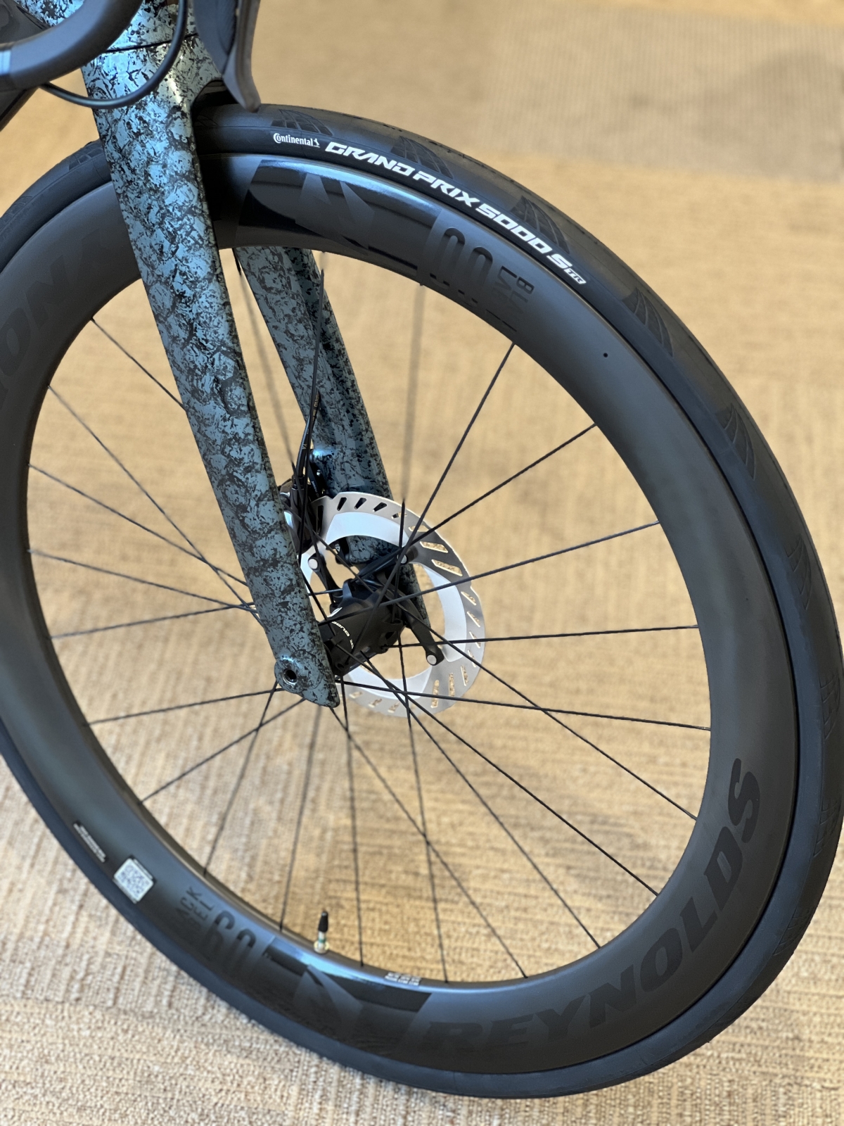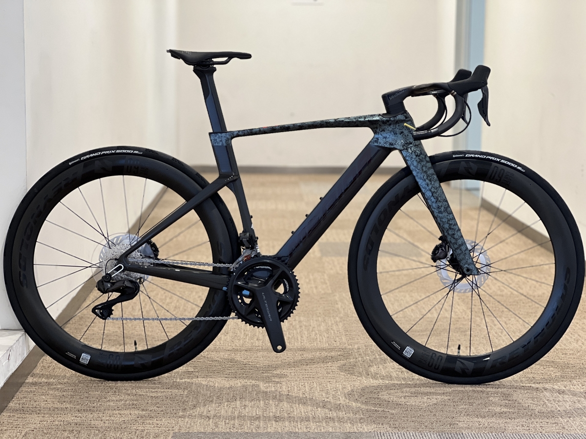 ホイールはReynolds Blacklabel60 Expert DB。内幅21mmでチューブレス対応、重量も1540gとこのリムハイトにしては軽量です。タイヤもContinental GP5000S TRを装着しているのでシーラントさえ追加で購入すればチューブレス化も可能です。
